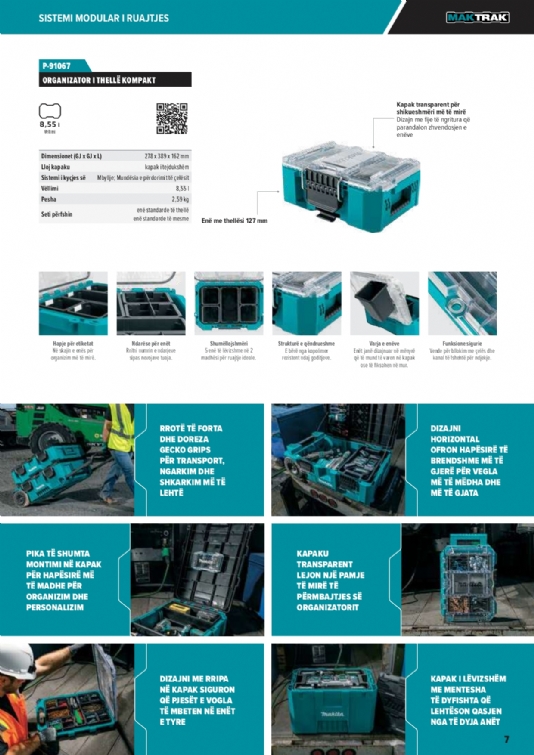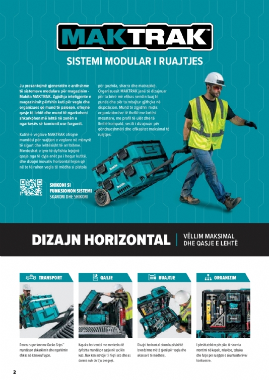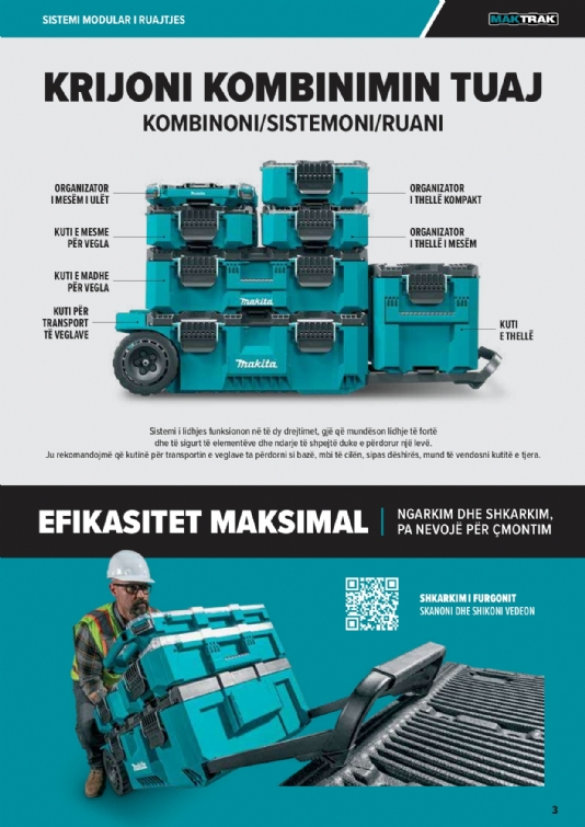 Ju prezantojmë gjeneratën e ardhshme të sistemeve modulare për magazinim - Makita MAKTRAK. Zgjidhja inteligjente e magazinimit përfshin kuti për vegla dhe organizues që mund të palosen, ofrojnë qasje të lehtë dhe mund të ngarkohen/ shkarkohen më lehtë në zonën e ngarkesës së kamionit ose furgonit.